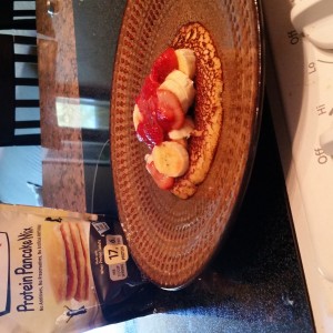 Last night I got something in the mail I was way excited about...PROTEIN PANCAKE MIX! I found Flap Jacked Protein Pancake mix online and quickly decided I had to try it. This morning I made just 1 pancake to test it out, and topped it with some fresh strawberries and bananas. It was delicious. I used that little protein boost to help me out during my workout at the gym and am feeling great!