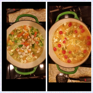 Brown chicken in a Tbl spoon of oil, add all the vegetables, I do it one at a time as I chop it up, add in the broth, seasonings to taste, add coconut milk and last the grape tomatoes. Simmer until the vegetables are tender and chicken is cooked through.