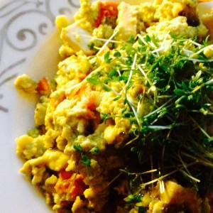 Dinner: mushrooms, avocado, chicken breast fillet, tomatoes, eggs, cress