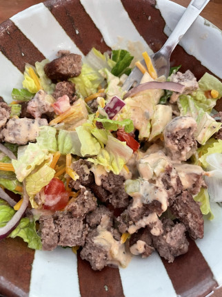 - My first few pounds came off with little effort. It was more of a mental exercise than a physical exercise. The next few pounds are going to be a little more difficult though I think. My goal for this week is to stay on my feet throughout the day as much as possible. It’s those moments when I’m sitting down scrolling on my phone where I get into the most trouble with snacking. So when I get home from work, which is a job I’m already standing for the whole time, I plan to do yardwork and housework and just to be more productive overall! Hopefully by the end of the day, I will be too tired to stay up long enough to convince myself that I need to eat something else! Here’s a photo of one of my healthy meals. It’s a cheeseburger salad with thousand Island dressing! Low carb, high protein, and the dressing gives it a lot of flavor!
